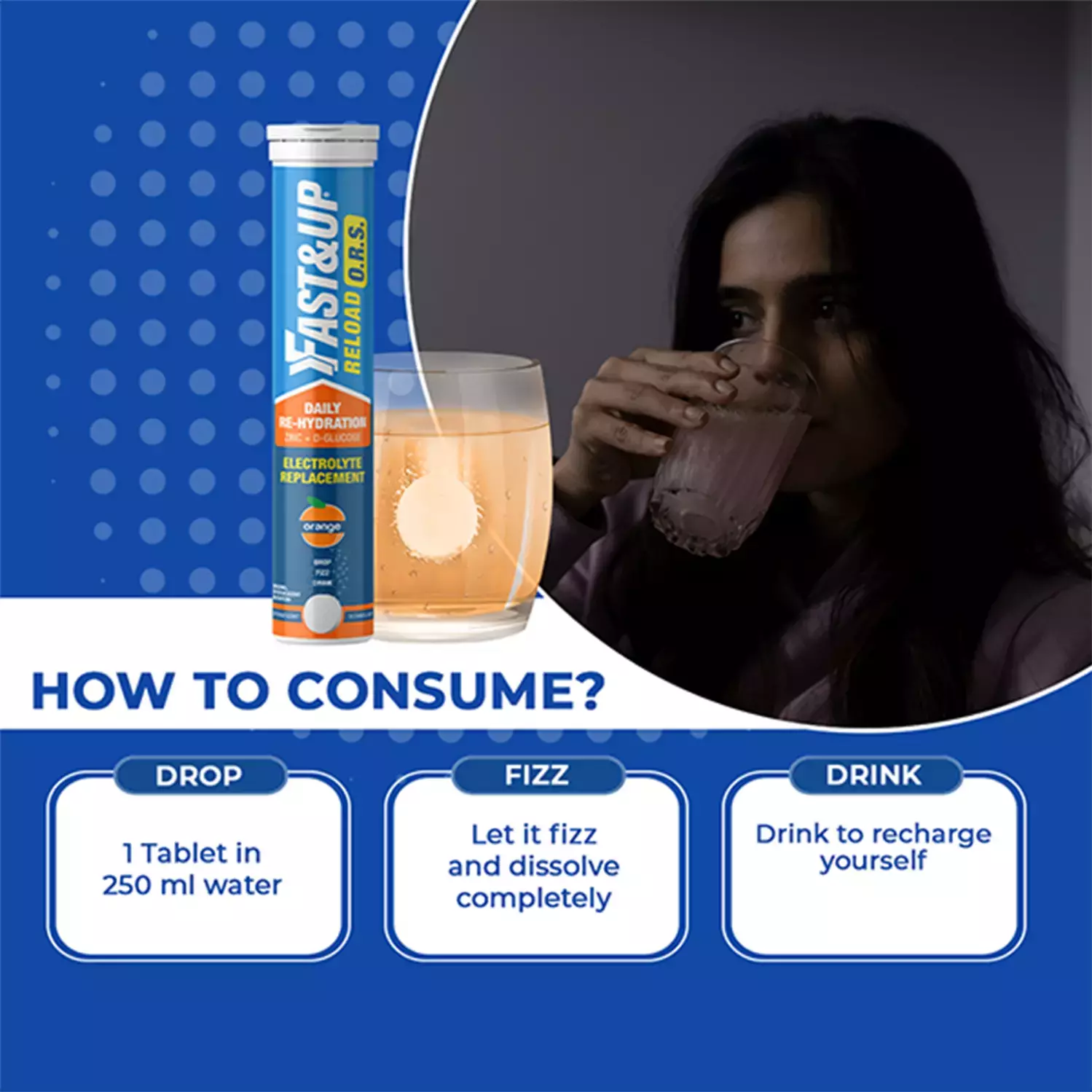 Dissolve 1 effervescent tablet in water and drink immediately as per label. Use during/after workout or heat exposure; do not swallow tablet whole.